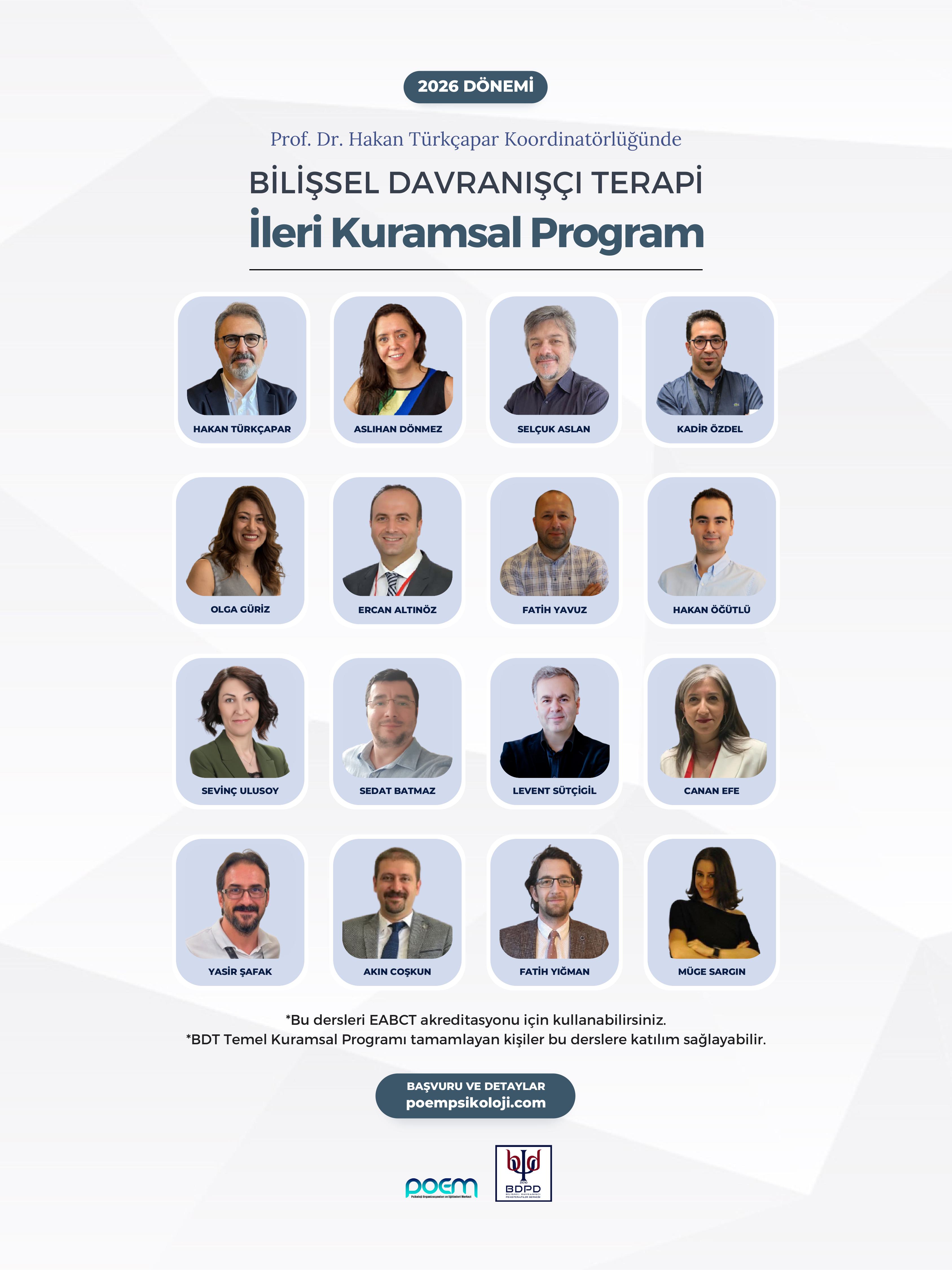 Bu programda katılımcıların bilişsel davranışçı terapiler içinde üçüncü dalga olarak adlandırılan “Kabul ve Kararlılık Terapisi” ve “Metakognitif Terapi” yanı sıra kronik ruhsal rahatsızlıklar ve kişilik bozukluklarının tedavisinde etkin şekilde kullanılan “Şema Terapi”, “Rasyonel Emotif Davranışçı Terapi” ve “Diyalektik Davranış Terapisi” hakkında genel bilgiler edinmesi amaçlanır.